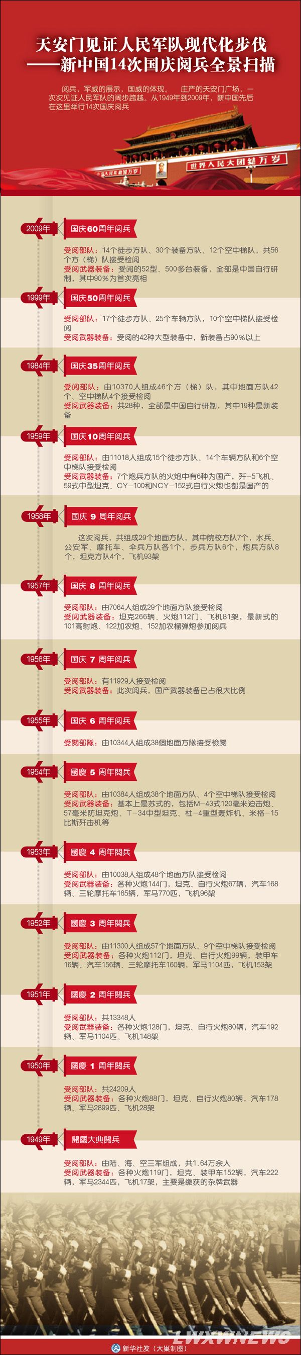 新华网北京8月21日电(记者李宣良、王经国)阅兵,军威的展示,国威的体现。庄严的天安门广场,一次次见证人民军队的阔步跨越。从1949年到2009年,新中国先后在这里举行14次国庆阅兵。