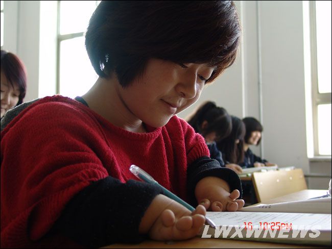 然而,上学的路远远没有小妹想象的那样顺畅。由于手臂畸形,连铅笔都握不住,像正常孩子一样按时完成作业对小妹都是一种奢望。从此,小妹家那件昏暗的老房子里,灯总是亮到临晨一点或更晚,除努力完成家庭作业,更多的时间用于双臂夹笔练习写字。夏天,小妹就在自家的院子里,吃力地蹲在地上,双臂夹着棍子联系写字——这样的情景一直延续到高考。