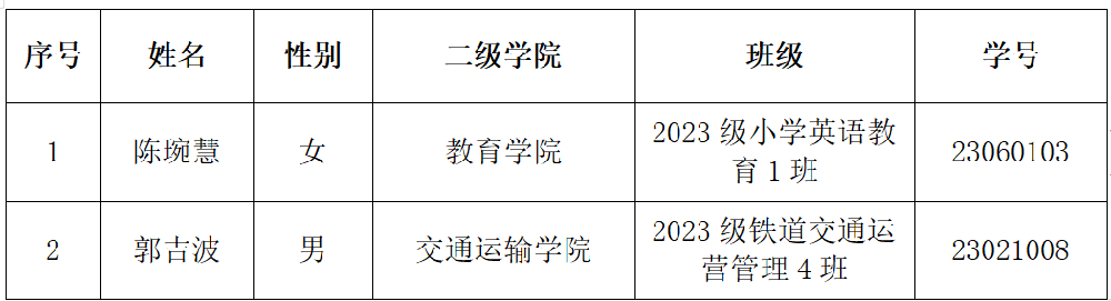 经2025年10月11日学院国家奖学金评审领导小组会议审议,确定陈琬慧、郭吉波两名同学为2024-2025学年国家奖学金推荐人选,现予以公示,公示期2025年10月11日-10月17日,如有异议,请向学生处反映:18893114462。具体名单如下: