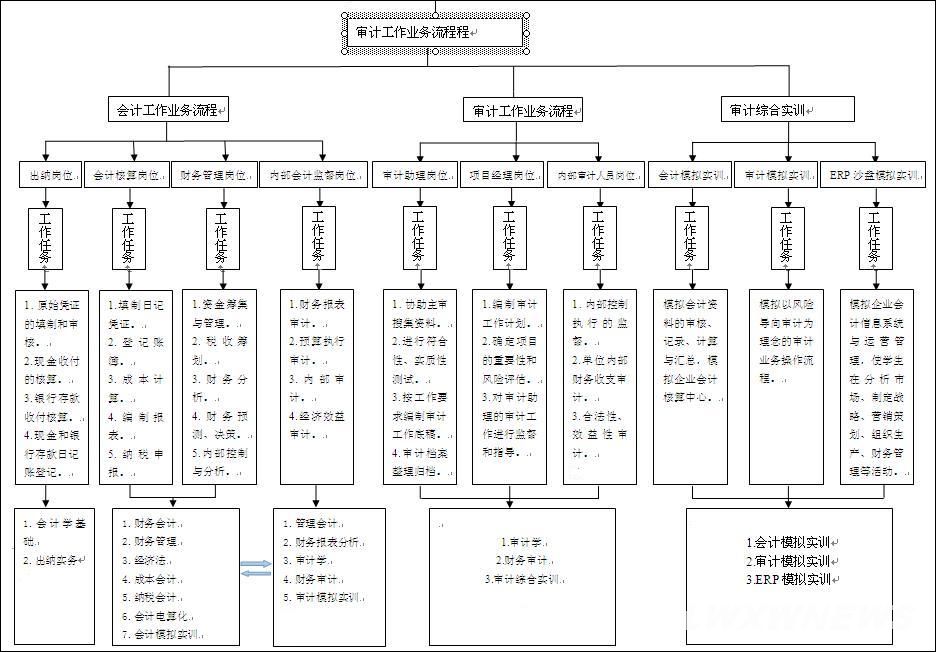 携手中小微企业,基于审计工作岗位要求,以能力的递进提升为主线,坚持育人与服务有机融合,源于企业会计核算与管理以及民间审计任务,即课程结构设计基于审计工作业务流程对于相应工作岗位,根据岗位任务对于相应的岗位职能要求开设课程,形成与岗位工作紧密联系的专业课程体系,培养提升学生工作实践能力。