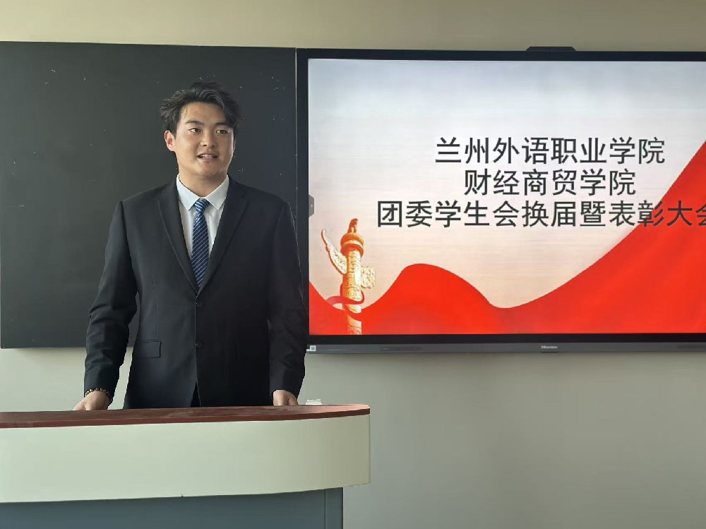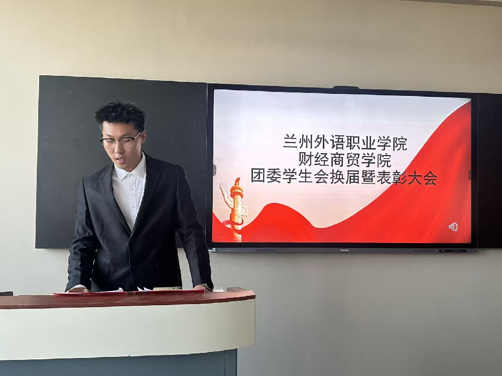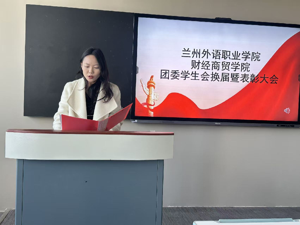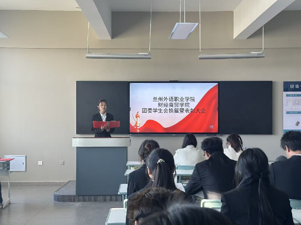 为加强学生组织建设,传承学生工作优良传统,激发青年学子的责任感与使命感,2025年11月13日下午,兰州外语职业学院财经商贸学院在学院报告厅隆重举行团委学生会换届暨表彰大会。财贸学院团学负责人王沛、校团委杨柳老师、上届学生会成员、新一届学生干部候选人及学生代表齐聚一堂,共同见证这一承前启后、继往开来的庄严时刻。大会由组织部部长李筱涵主持。