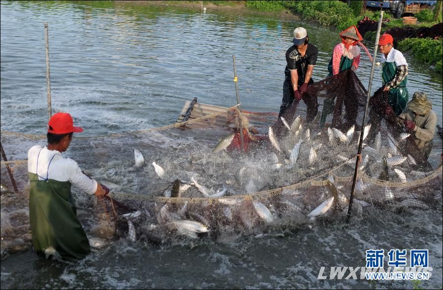2012年9月3日,台南市学甲区的养殖户在捕鱼。当日,作为大陆与台湾第二批契约养殖的虱目鱼开始捕捞。根据契约,上海水产集团将以每台斤(1台斤合600克)45元新台币的保证价,收购当地120家养殖户360万台斤的虱目鱼。