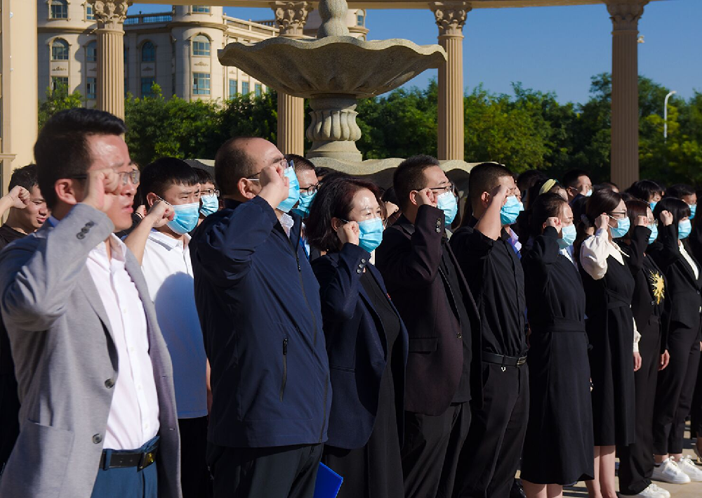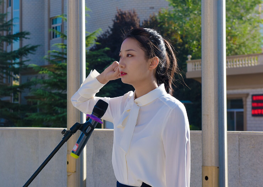 在新教职工代表杨雅雯老师的带领下,全体教职工在国旗下庄重宣誓。