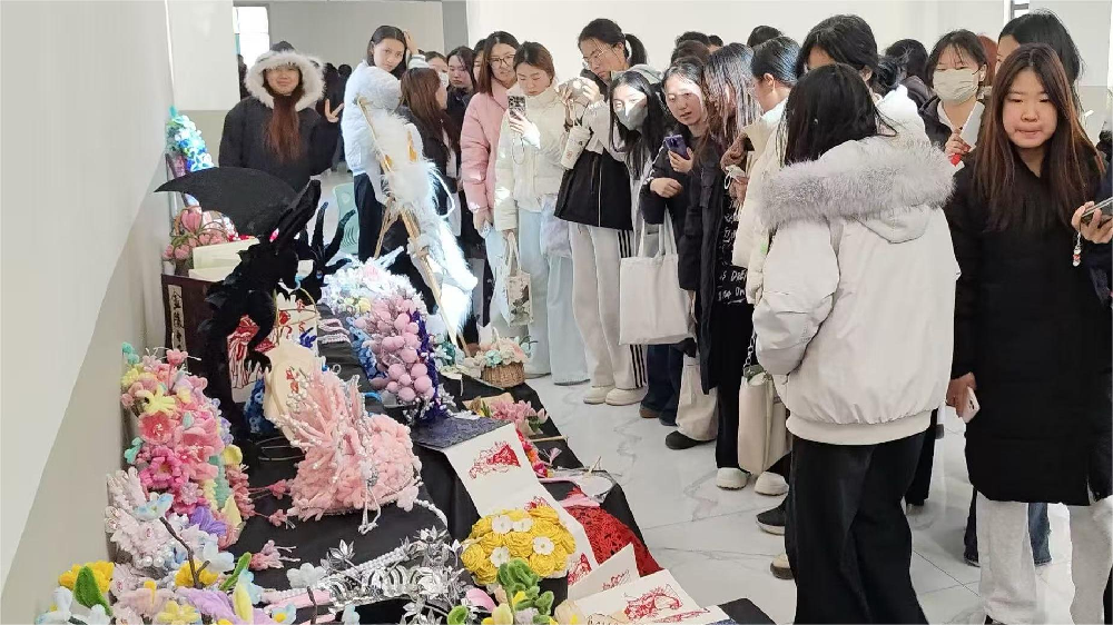 展台上,粉蓝相间的戏曲头面精致灵动,缠花、绒花制成的花束与团扇清雅别致,还有镂空剪纸、布艺龙形摆件等作品,将传统工艺与现代审美巧妙融合。简单的材料经学生们的巧手改造,变成了兼具美感与巧思的艺术品,引得围观师生连连赞叹。