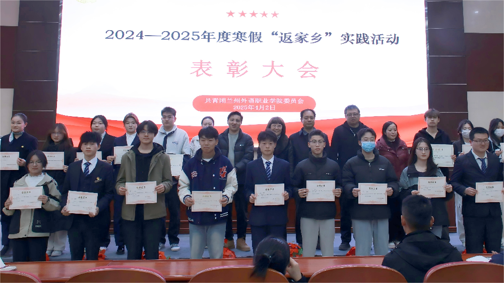 二、2025年4月2日下午,兰州外语职业学院于学术报告厅隆重举行2024-2025年寒假“返家乡”社会实践活动表彰大会。此次大会举办不仅是对过去寒假“返家乡”社会实践活动的全面回顾与总结,更是对未来学院实践教育工作的有力展望。