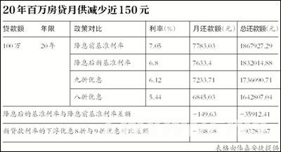 以20年期限的100万元放贷计算,按照每月均等的还款方法,此次降息前利率为7.05%,月均还款7783元,支付利息总额86.7927万元;而按照降息25个基点之后利率为6.8%,月均还款7633.4元,下降了接近150元,利息总额83.2万元,减少了3.6万元。