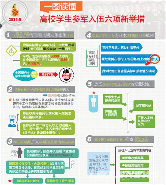 内容来源:《教育部办公厅关于进一步做好高校学生参军入伍工作的通知》(教学厅[2015]3号)